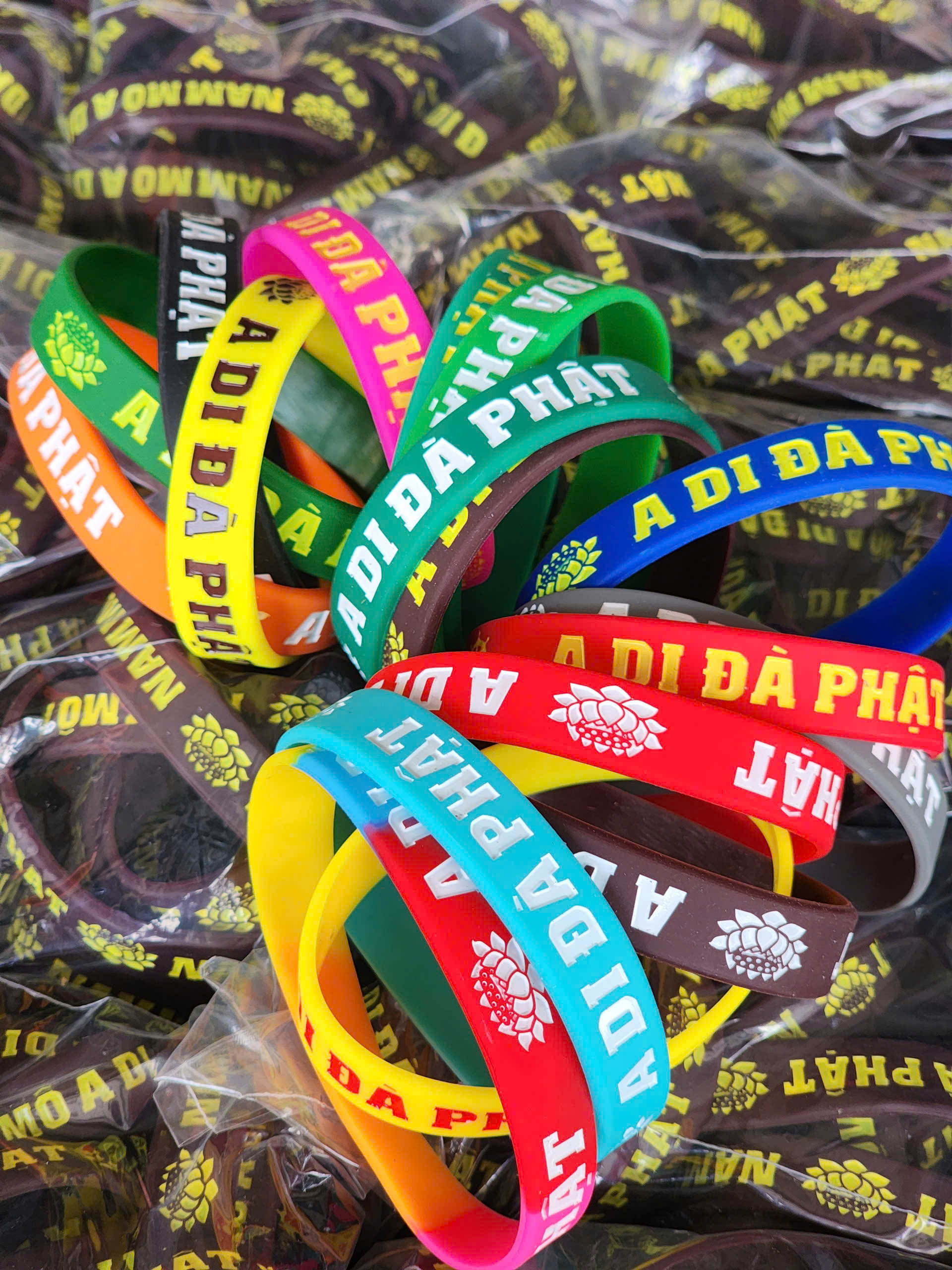 Chúng tôi chuyên in ấn vòng tay cao su theo yêu cầu của khách hàng, ngoài ra chúng tôi còn có các sản phẩm vòng a di đà phật hoặc vòng tay cao su tiếng phạn dành cho người lớn và đa dạng màu sắc vòng hơn.